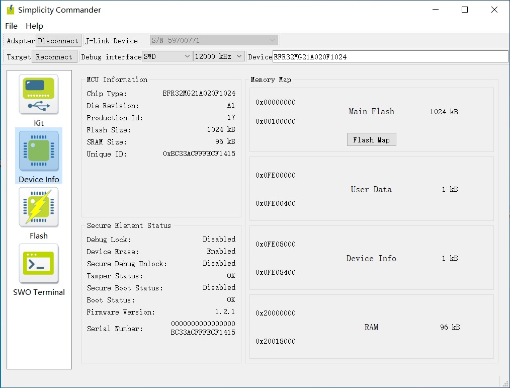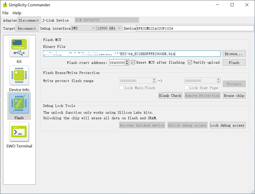 需要注意的是,每个Mist设备都包含有签名,需要烧录至MG21系列的UserData区,Flash地址为0x0FE00000,签名内容包括:设备EUI64、平台UUID、固件信息以及设备License等,设备签名可通过 usersiggen 工具获得。